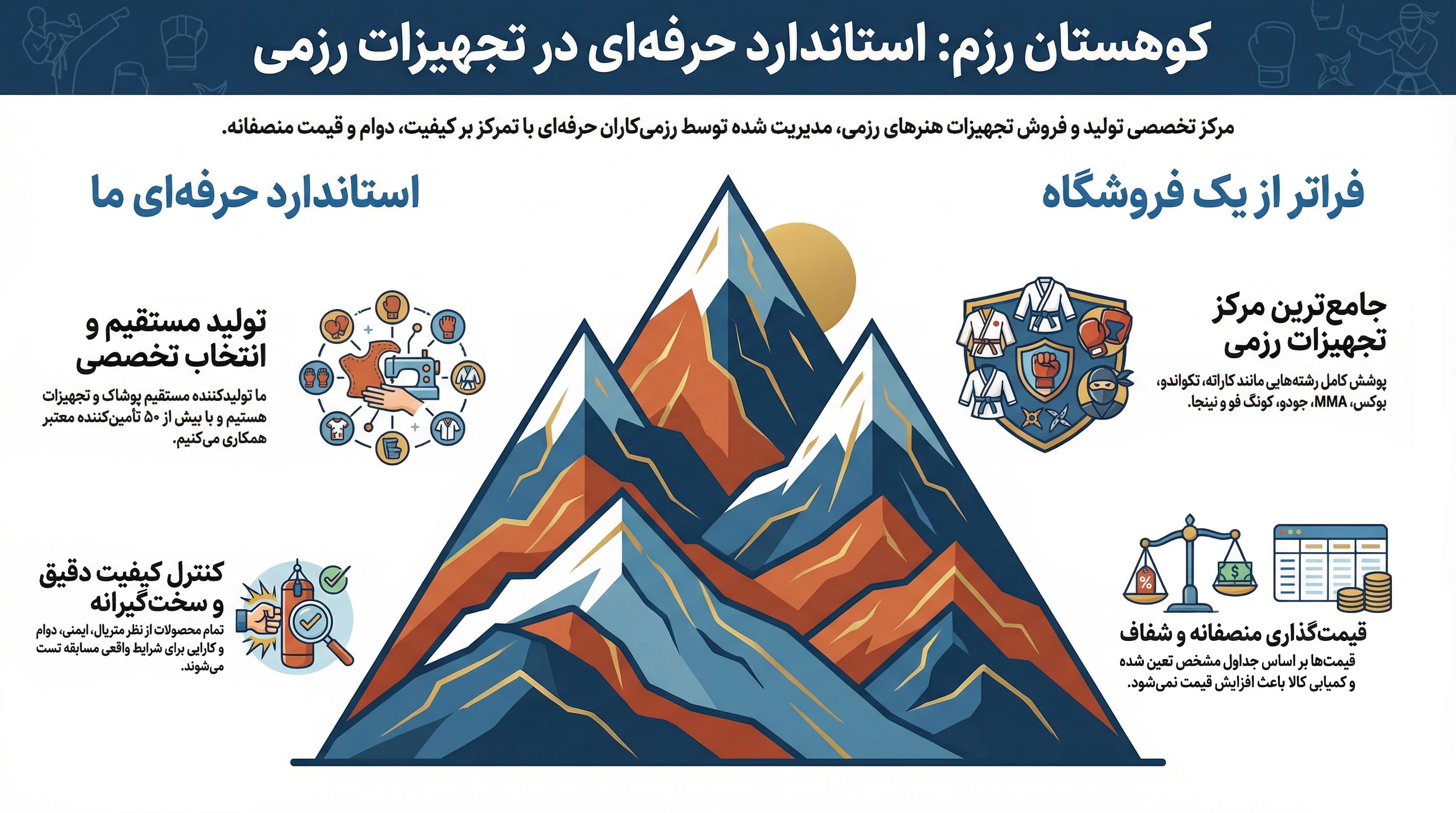 کوهستان رزم (Koohestan Razm) یک مجموعه تخصصی در حوزه هنرهای رزمی است که در زمینه طراحی، تولید و عرضه پوشاک و تجهیزات رزمی، آموزش تخصصی و تولید محتوای هدفمند فعالیت میکند؛ مجموعهای که با نگاهی عمیق، مسئولانه و بلندمدت شکل گرفته است.