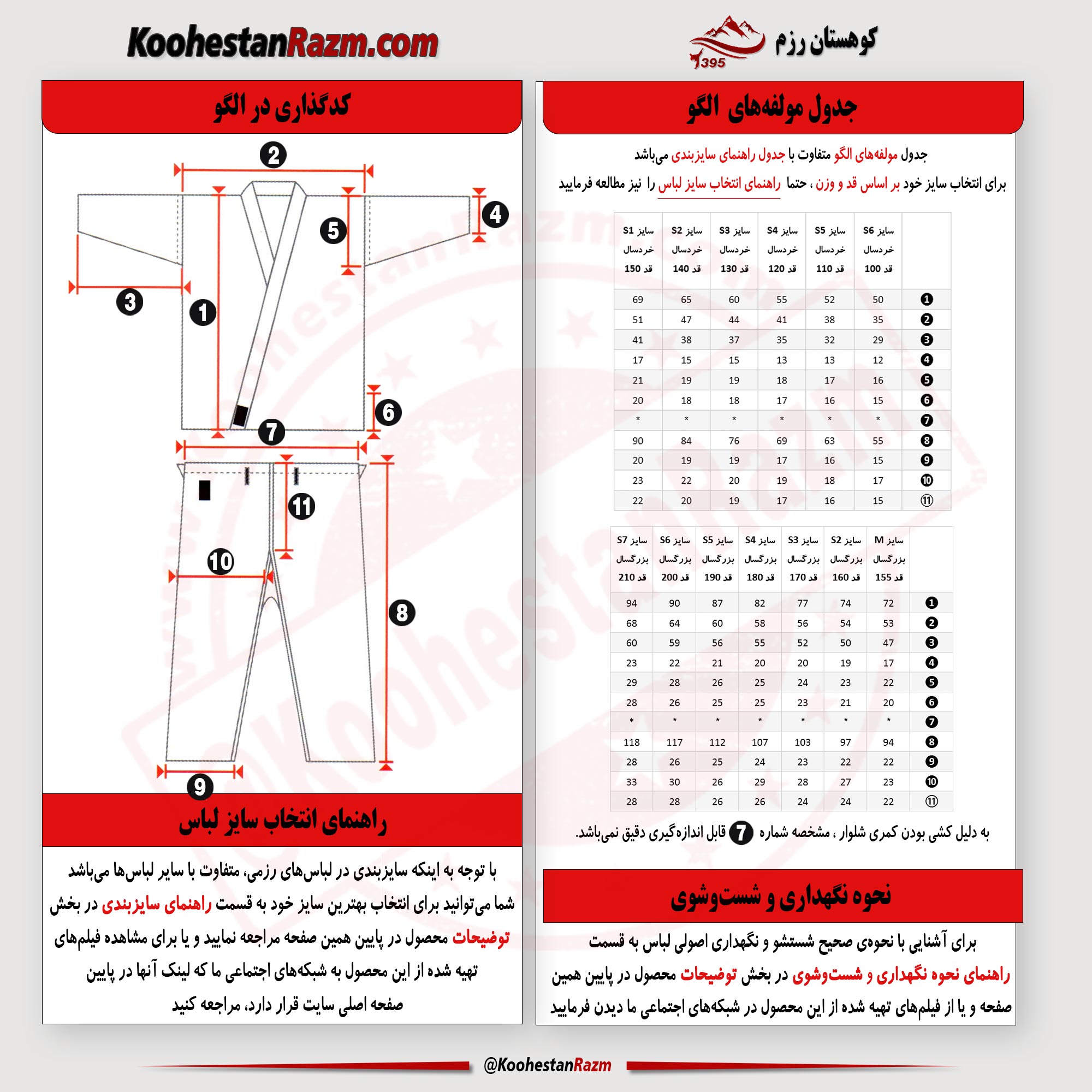 نکته قابل توجه و بسیار مهم در این مدل، تنوع بسیار بالای سایزبندی آن است، ۶ سایز خردسال (از کودک 3 ساله) و ۷ سایز برای بزرگسالان ( تا قد 200 سانت) که گستره ی وسیعی از قد و وزن ها را پوشش می دهد . در مجموع ۱۳ سایز برای اینکه هر هنرجو، با هر شرایط فیزیکی، لباسی دقیقاً مناسب داشته باشد. پس اگر به دنبال خرید یک مدل لباس برای باشگاه و یا فروشگاه خود هستید که تمامی سایزهای ممکن را یکجا پوشش بده و هیچ گاه در سایزبندی برای هنرجویان و مشتریان خود دچار مشکل نشوید، این مدل بهترین مدلی است که ما می توانیم به شما پیشنهاد دهیم. شلوار تک این لباس در این سایت موجود بوده و می توانید هر گاه به یک شلوار کمکی از همان جنس لباستان نیازمند شدید به راحتی آن را سفارش دهید. در پایان برای آنکه لباس را به خوبی و از نزدیک ببینید و بررسی کنید چندین عکس از زوایای مختلف لباس برای شما گرفته شده است که در قسمت تصاویر محصول قابل مشاهده است.